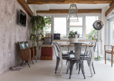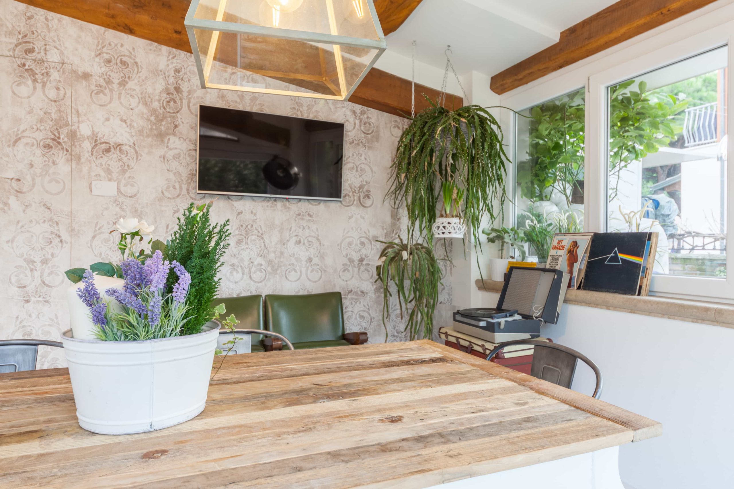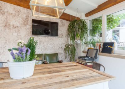 Nel rispetto dei gusti dei proprietari, tutta la casa è stata arredata con una mescolanza di stili, tra il moderno e l’antico-vintage.