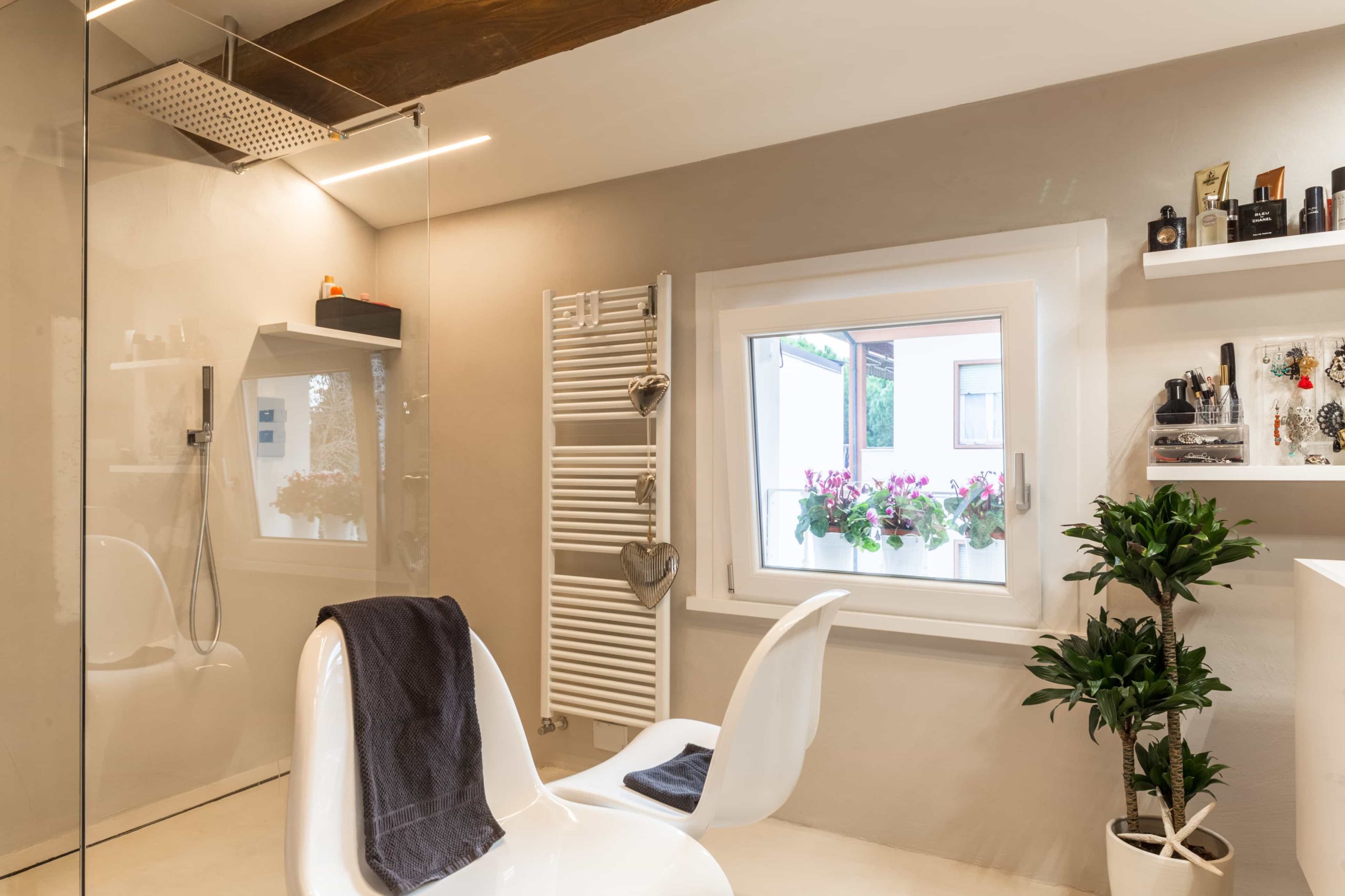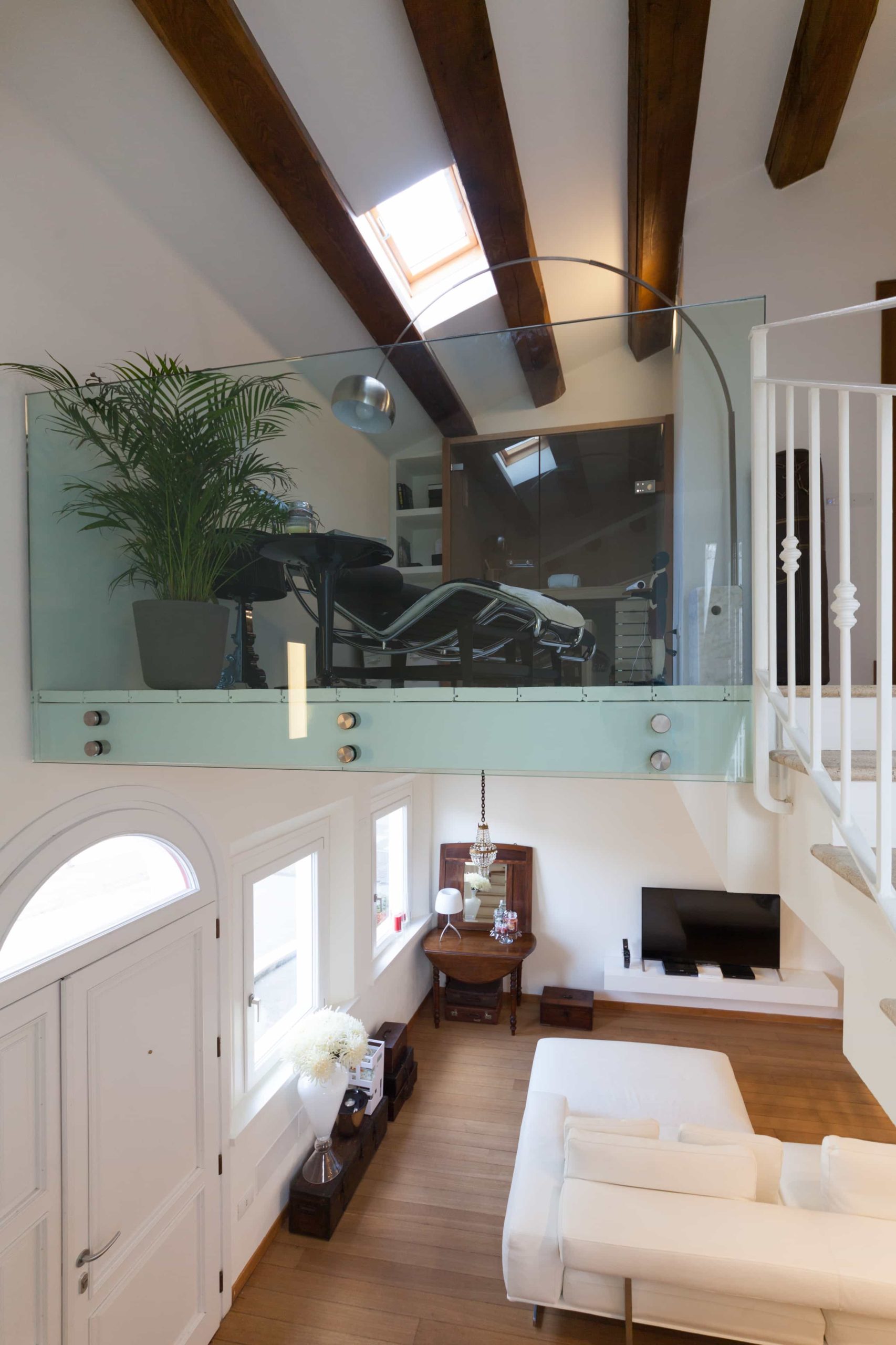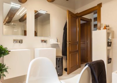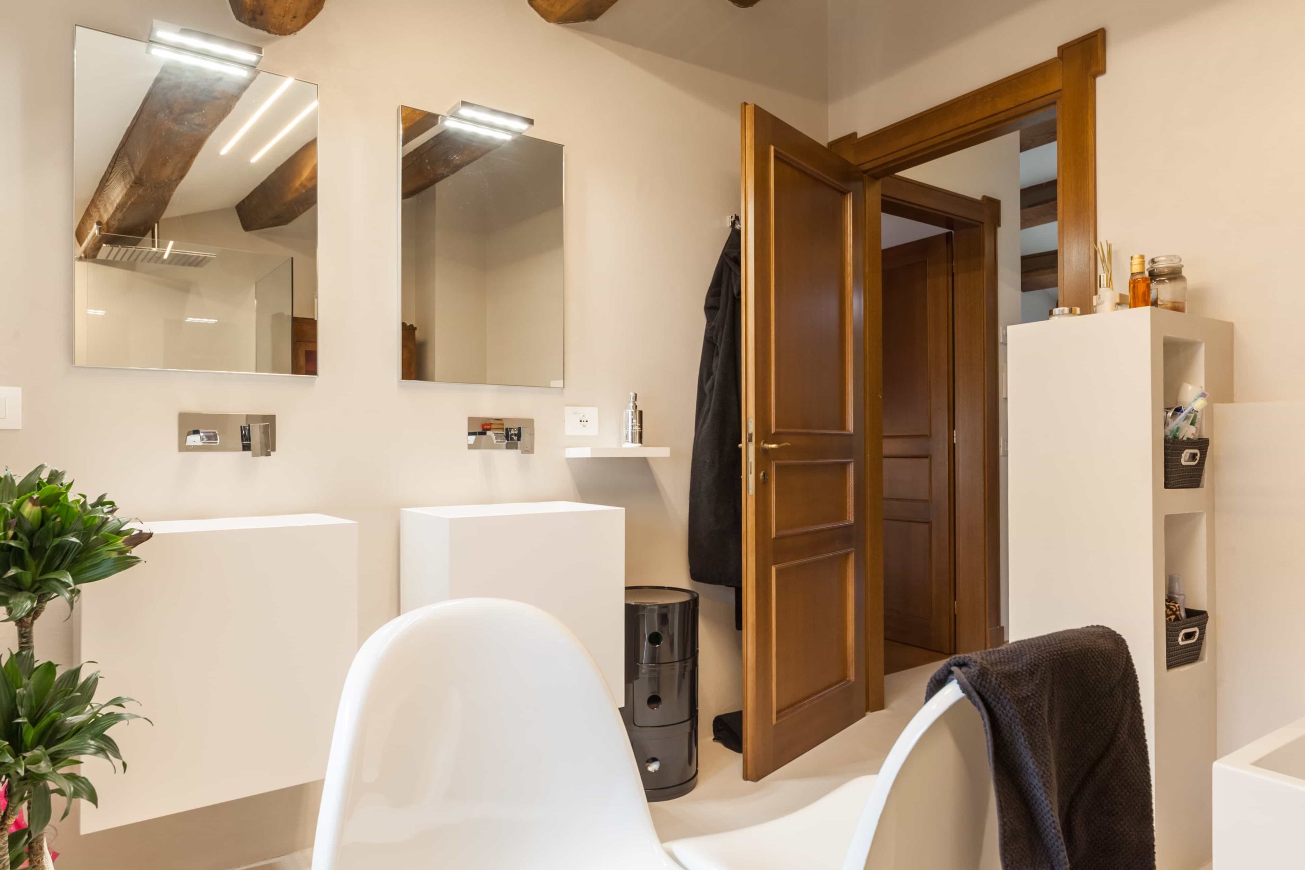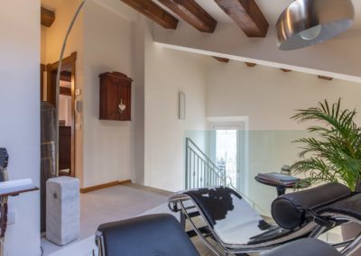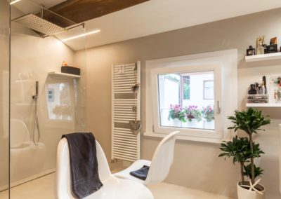 Il piano superiore è stato ampliato con un soppalco per il relax e una zona studio. I bagni del primo piano sono stati demoliti e ricostruiti da zero, eliminando l’ingombrante vasca a favore di una doccia a due posti in vetro.