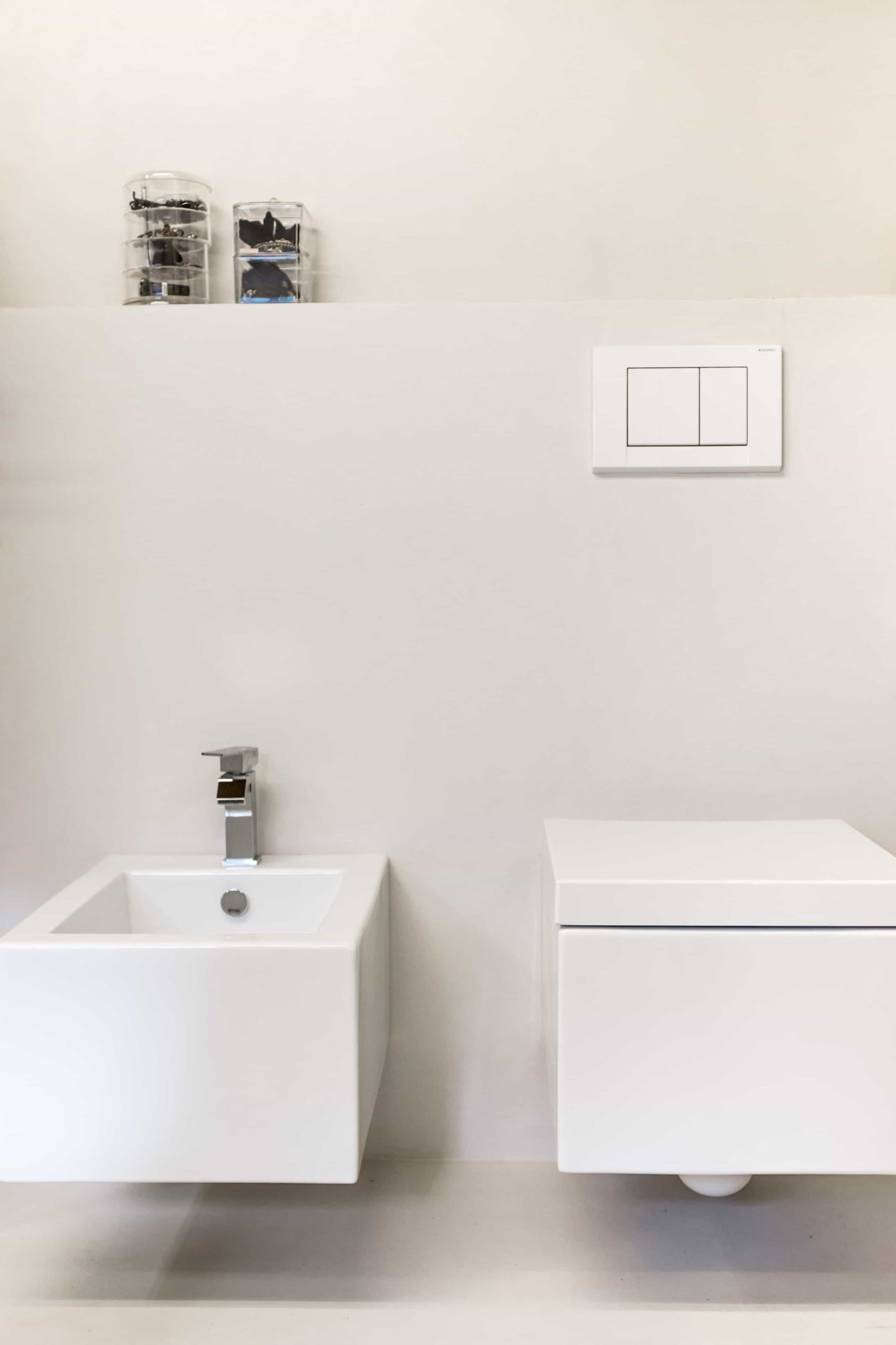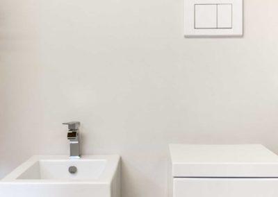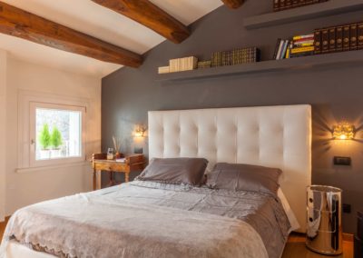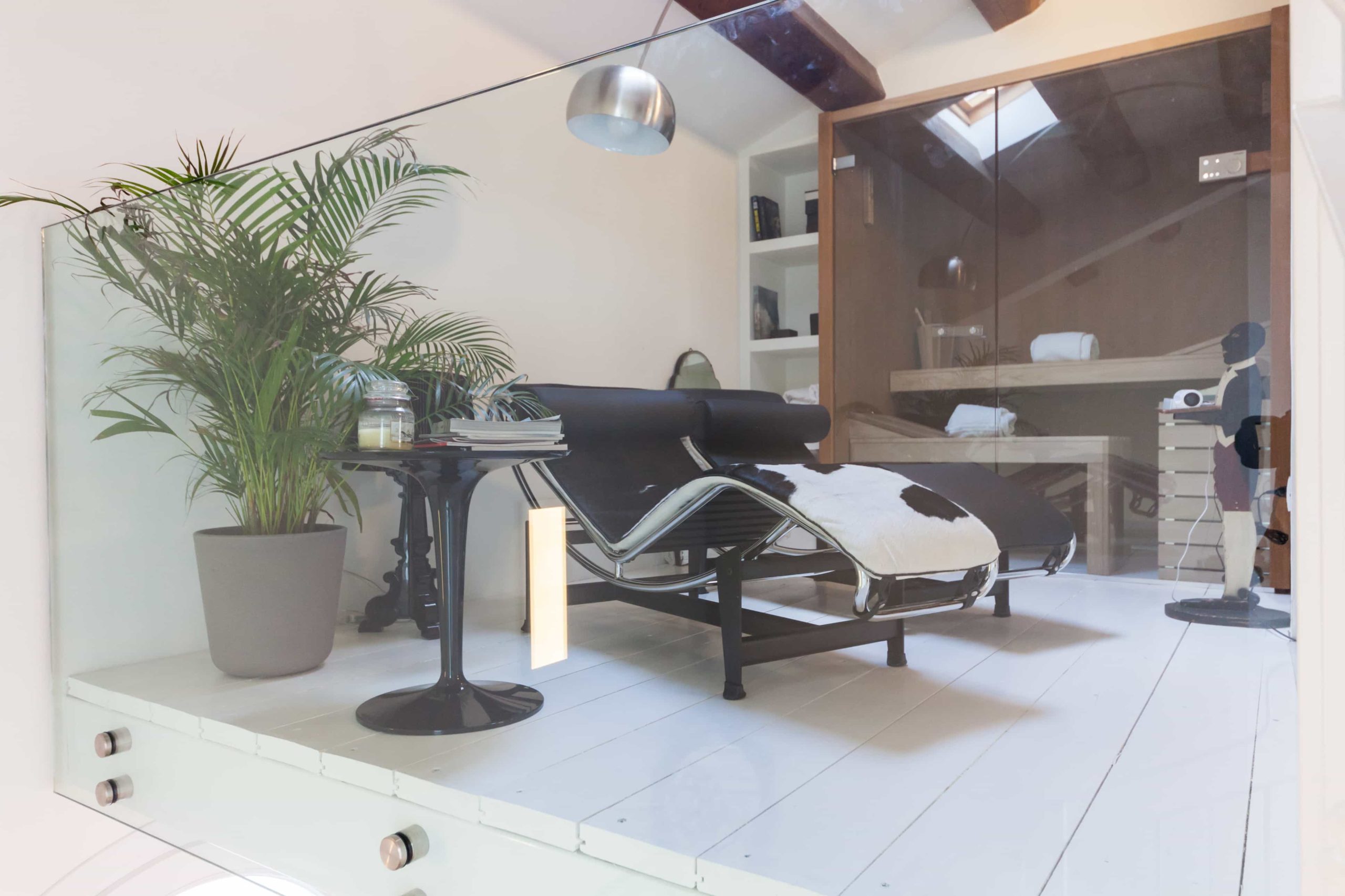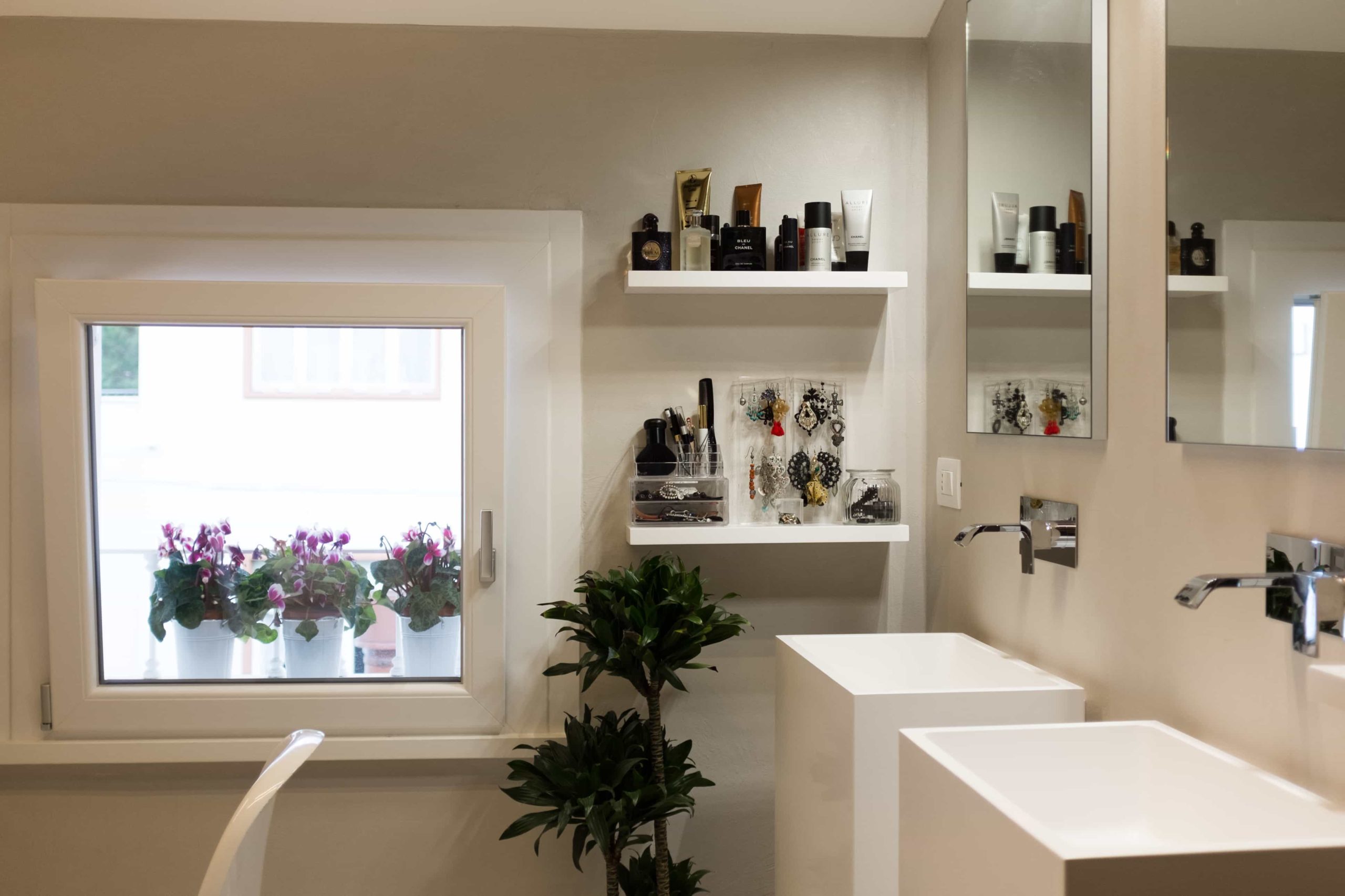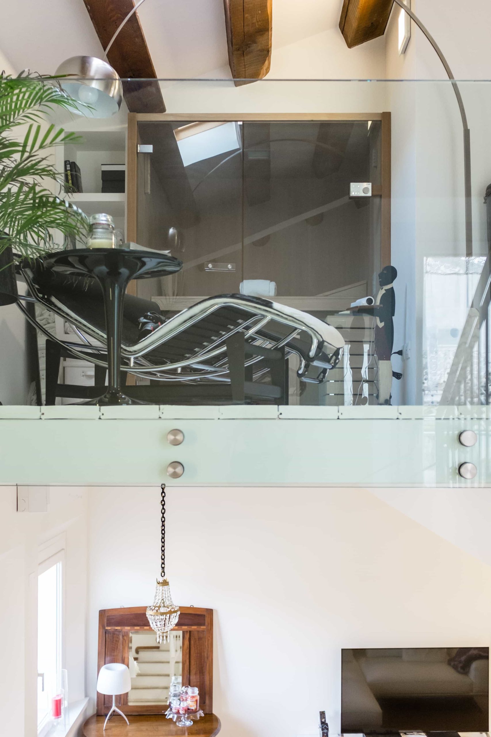 Il piano superiore è stato ampliato con un soppalco per il relax e una zona studio. I bagni del primo piano sono stati demoliti e ricostruiti da zero, eliminando l’ingombrante vasca a favore di una doccia a due posti in vetro.