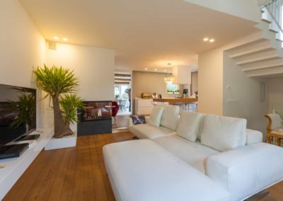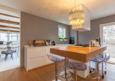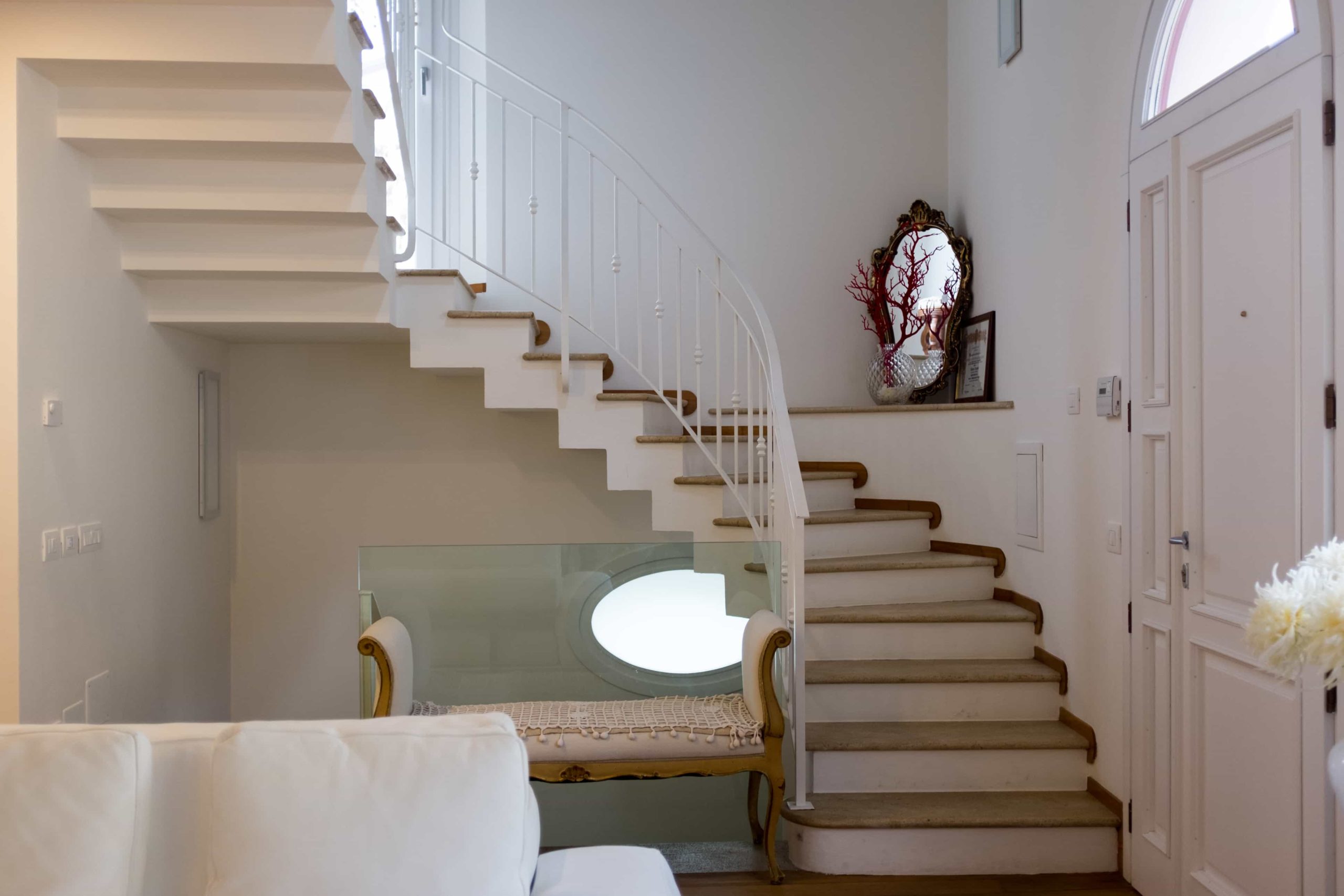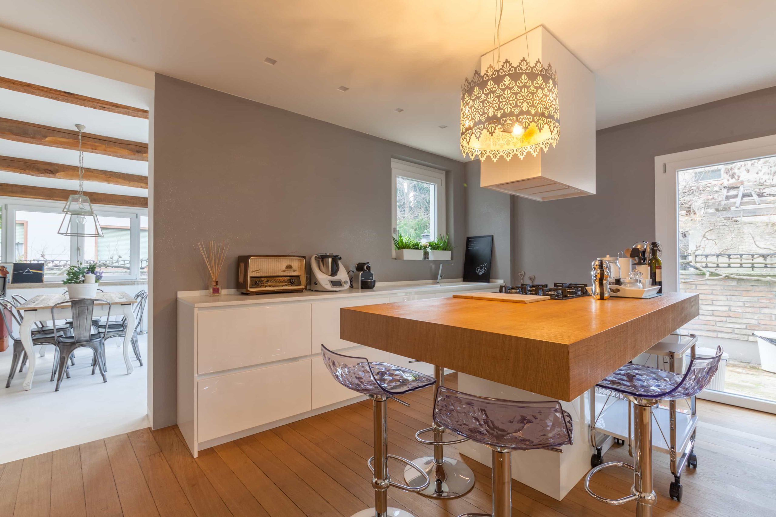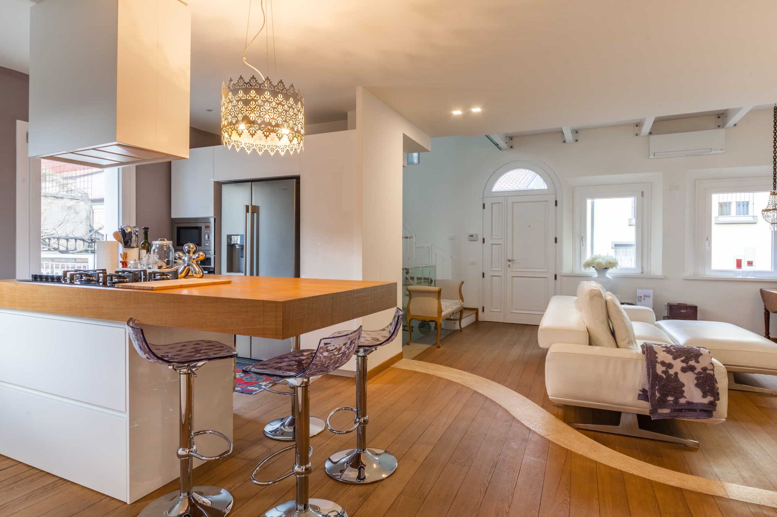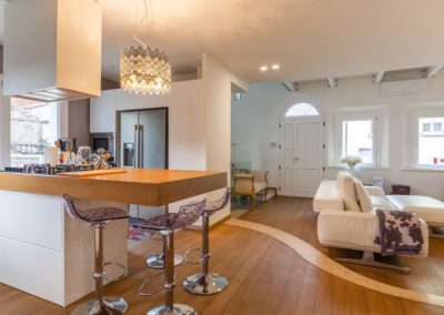 A. piano terra si e’ riqualificata una veranda esistente sostituendo gli infissi, installando il riscaldamento a pavimento e rivestimento in resina. Il bagno di servizio e’ divenuto “degli ospiti” e una moderna cucina open-space con piano snack ha trovato posto nel living.